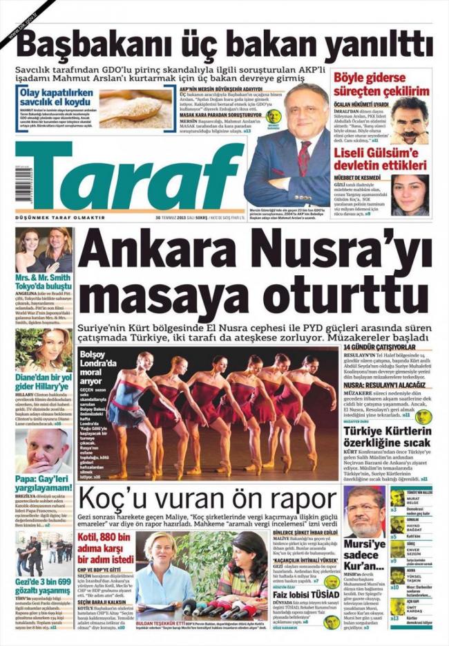 «Η Άγκυρα κάθισε στο τραπέζι την Αλ Νουσρά» είναι ο τίτλος της Taraf. H τουρκική εφημερίδα αναφέρει πως η Τουρκία έχει επιβάλλει στους ισλαμιστές αντάρτες της Συρίας να κάτσουν στο τραπέζι των διαπραγματεύσεων με τους Κούρδους της βόρειας Συρία. Η Τουρκία ζητά να υπάρξει κάποια εκεχειρία, όμως σύμφωνα με την εφημερίδα οι ισλαμιστές ζητούν να τους επιστραφεί ο έλεγχος της πόλης Ρεσουλάϊν.