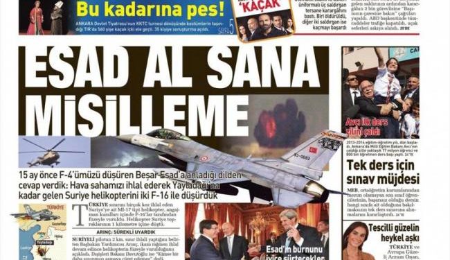 « Άσαντ, πάρε να δεις αντίποινα» είναι ο τίτλος της Sabah. H τουρκική εφημερίδα αναφέρεται στην κατάρριψη του ελικοπτέρου της Συρίας από τουρκικά μαχητικά και γράφει πως « απαντήσαμε στον Άσαντ με την γλώσσα που καταλαβαίνει καθώς πριν από 15 μήνες είχε καταρρίψει δικό μας RF-4, καθώς τώρα με δυο μαχητικά F-16 καταρρίψαμε ελικόπτερο της Συρίας».