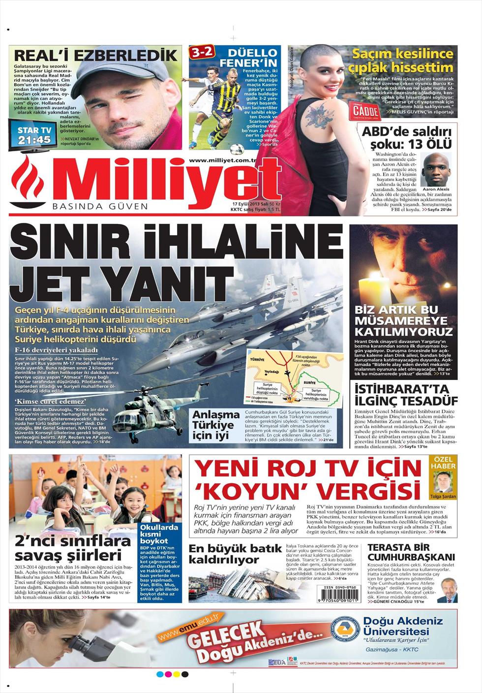 «Άμεση απάντηση στην παραβίαση των συνόρων» είναι ο τίτλος της Milliyet. H τουρκική εφημερίδα υπενθυμίζει πως η Τουρκία από το 2012 όπου καταρρίφθηκε το RF-4 από την αεράμυνα της Συρίας έχει αλλάξει τους κανόνες εμπλοκής. « Μόλις παραβιάστηκε ο εναέριος χώρος στα σύνορα το συριακό ελικόπτερο καταρρίφθηκε άμεσα» γράφει η εφημερίδα.