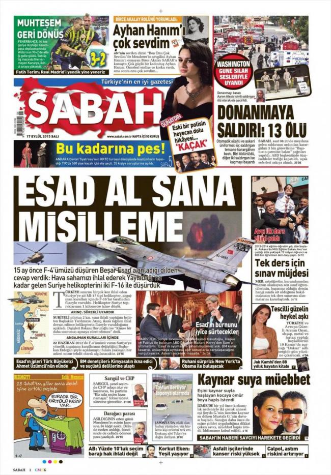 « Άσαντ, πάρε να δεις αντίποινα» είναι ο τίτλος της Sabah. H τουρκική εφημερίδα αναφέρεται στην κατάρριψη του ελικοπτέρου της Συρίας από τουρκικά μαχητικά και γράφει πως « απαντήσαμε στον Άσαντ με την γλώσσα που καταλαβαίνει καθώς πριν από 15 μήνες είχε καταρρίψει δικό μας RF-4, καθώς τώρα με δυο μαχητικά F-16 καταρρίψαμε ελικόπτερο της Συρίας».