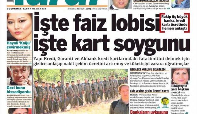 «Αυτό είναι το λόμπι των επιτοκίων, αυτή είναι η ληστεία των καρτών» είναι ο τίτλος της Taraf. H τουρκική εφημερίδα αναφέρει πως οι τρεις μεγαλύτερες ιδιωτικές τράπεζες τηε γειτονικής χώρας συμφώνησαν να αυξήσουν το ποσό κράτησης στις αναλήψεις μετρητών από πιστωτικές κάρτες.