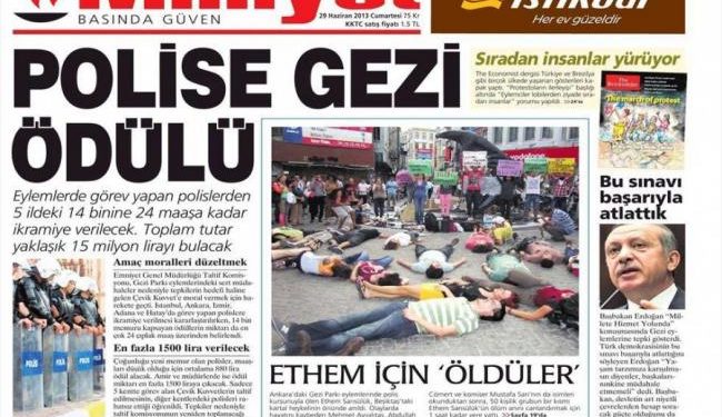 «Βραβείο Γκεζί στην αστυνομία» είναι ο τίτλος της Milliyet. H τουρκική εφημερίδα αναφέρει πως το τουρκικό δημόσιο επιβραβεύει τους 14.000 αστυνομικούς που συμμετείχαν στην αντιμετώπιση των διαδηλώσεων που ξεκίνησαν με αφορμή του πάκρου Γκεζί και θα λάβουν μπόνους μέχρι και 24 μισθούς!