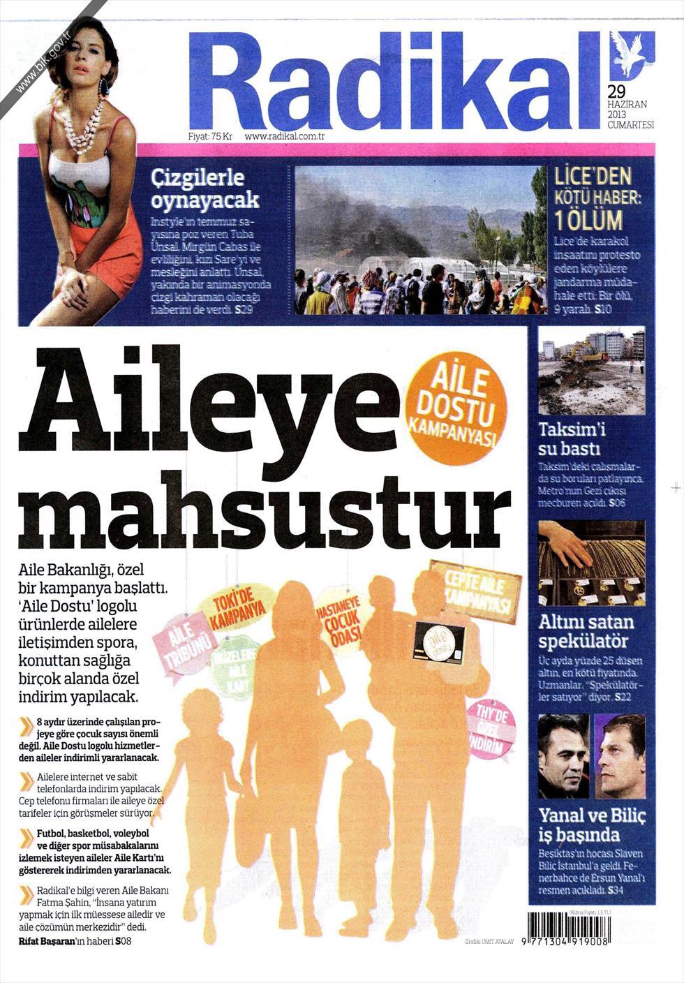 “Eιδικά για την οικογένεια» είναι ο τίτλος της Radikal. H τουρκική εφημερίδα αναφέρει πως το Υπουργείο Οικογένειας της Τουρκίας σε συνεργασία με μεγάλες εταιρείες θα ξεκινήσει εκστρατεία όπου θα γίνονται εκπτώσεις στις τιμές πολλών προϊόντων για οικογένειες.