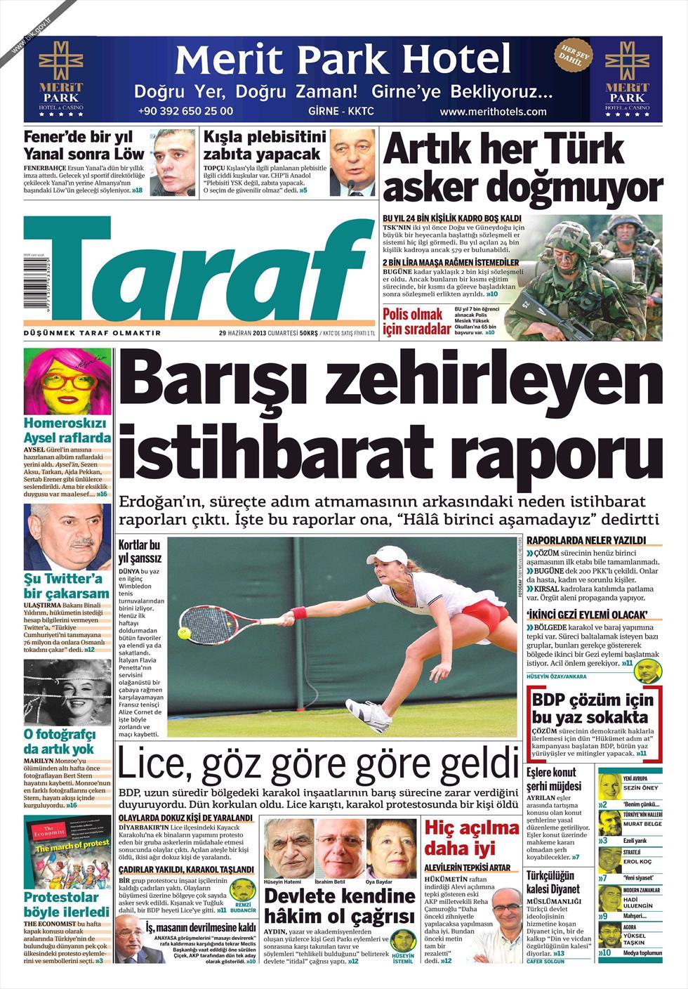 « Η έκθεση πληροφοριών που δηλητηριάζει την ειρήνη» είναι ο τίτλος της Taraf. H τουρκική εφημερίδα αναφέρει πως η έκθεση που έχει λάβει ο Ερντογάν παρουσιάζει πως το PKK δεν έχει αποσύρει μεγάλο μέρος των δυνάμεων του, πως στη νοτιοανατολική Τουρκία αυξάνεται η συμμετοχή στην οργάνωση. « Η κυβέρνηση βλέπει αυτές τις εκθέσεις και δεν κάνει τα απαραίτητα βήματα για την επίλυση του Κουρδικού» γράφει η Taraf.