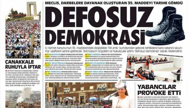 « Δημοκρατία δίχως ελαττώματα» είναι ο τίτλος της Αkşam. H τουρκική εφημερίδα αναφέρει πως το τουρκικό Κοινοβούλιο με νόμο περιόρισε τα καθήκοντα του στρατού που από εδώ και πέρα « θα αντιμετωπίζει μόνο τις απειλές που προέρχονται από το εξωτερικό».