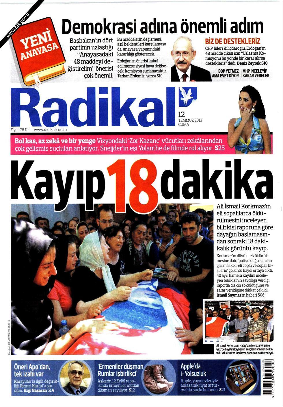 «Εξαφανισμένα 18 λεπτά» είναι ο τίτλος της Radikal. Η τουρκική εφημερίδα αναφέρει πως οι εικόνες από τον ξυλοδαρμό του διαδηλωτή Αλί Ιχσάν Κορκμάζ ο οποίος πέθανε έχουν εξαφανισθεί. Ο Αλί Κορκμάζ είχα τραυματιστεί στις διαδηλώσεις του πάρκου Γκεζί από τον ξυλοδαρμό της αστυνομίας και αγνώστων. Οι εικόνες από τις κρυφές κάμερες διαγράφηκαν από αγνώστους.