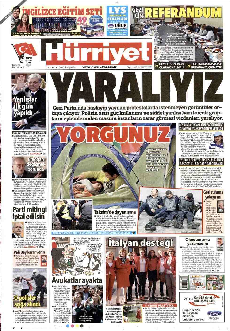 «Είμαστε λαβωμένοι» είναι ο τίτλος της Hürriyet. H τουρκική εφημερίδα αναφέρει πως « δημιουργούνται άσχημες εικόνες από τις διαδηλώσεις που εξαπλώθηκαν μετά τα γεγονότα στο πάρκο Γκεζί. Η υπερβολική χρήση βίας της αστυνομίας όπως και τα επεισόδια τα οποία προκαλούν κάποιες μικρές ομάδες προκάλεσαν «πληγές».