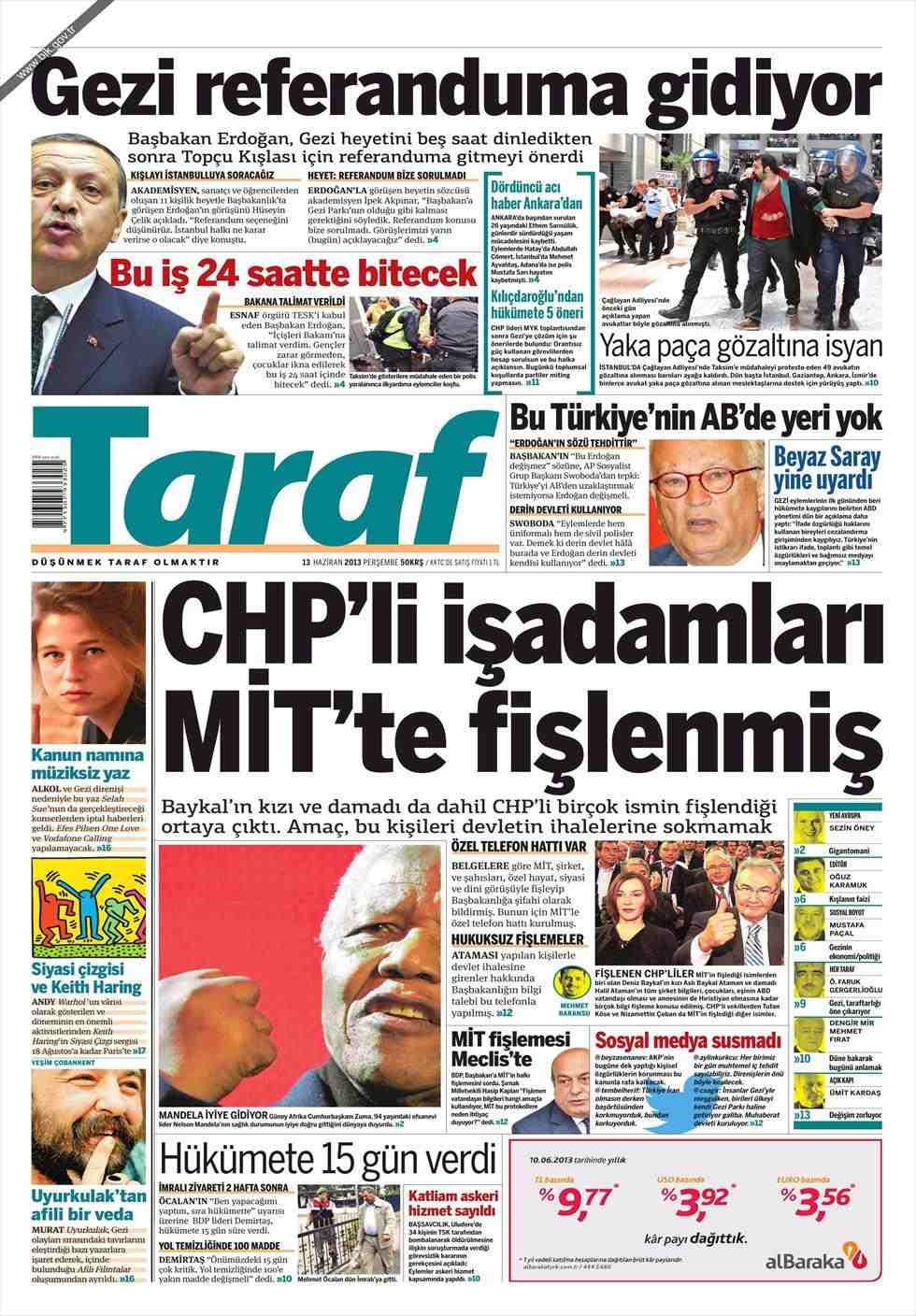 «Φακελώθηκαν επιχειρηματίες του Ρεπουμπλικανικού Λαϊκού Κόμματος (CHP)» είναι ο τίτλος της Taraf. H τουρκική εφημερίδα γράφει πως ακόμη και η κόρη όπως και ο γαμπρός του πρώην προέδρου toy CHP Nτενίζ Μπαϊκάλ αλλά και πολλοί άλλοι επιχειρηματίες που στήριζαν το κόμμα αυτό ήταν υπό παρακολούθηση των τουρκικών μυστικών υπηρεσιών της ΜΙΤ με στόχο την παρεμπόδιση τους για συμμετοχή σε δημόσιους διαγωνισμούς.