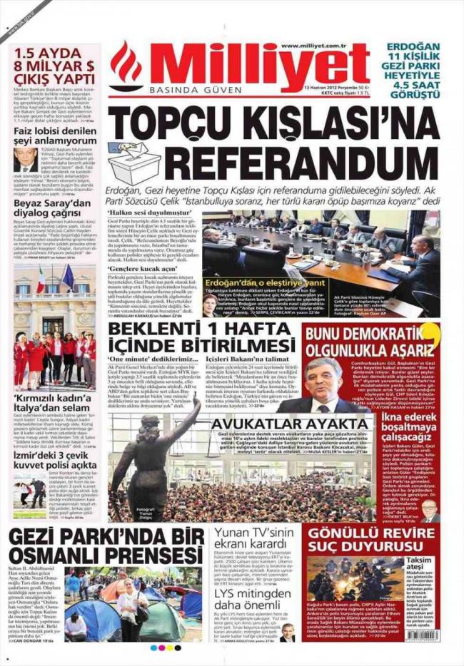« Δημοψήφισμα στο στρατώνα Τοπτσού» είναι ο τίτλος της Milliyet. Η τουρκική εφημερίδα αναφέρει πως ο Ερντογάν μετά τη συνάντηση των εκπροσώπων των διαδηλωτών του πάρκου Γκεζί αποφάσισε να ρωτήσει στο λαό για το μέλλον του πάρκου όπου έγιναν οι διαδηλώσεις.