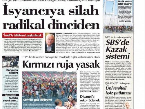 «Ο εξοπλισμός των επαναστατών είναι από τους φανατικούς ισλαμιστές» είναι ο τίτλος της Cumhuriyet. H τουρκική εφημερίδα αναφέρεται στη συνέντευξη του ηγέτη των επαναστατών στη Συρία Τζόρτζ Σάμπρα ο οποίος υποστήριξε πως τα όπλα των επαναστατών στη Συρία προέρχονται από του φανατικούς ισλαμιστές.