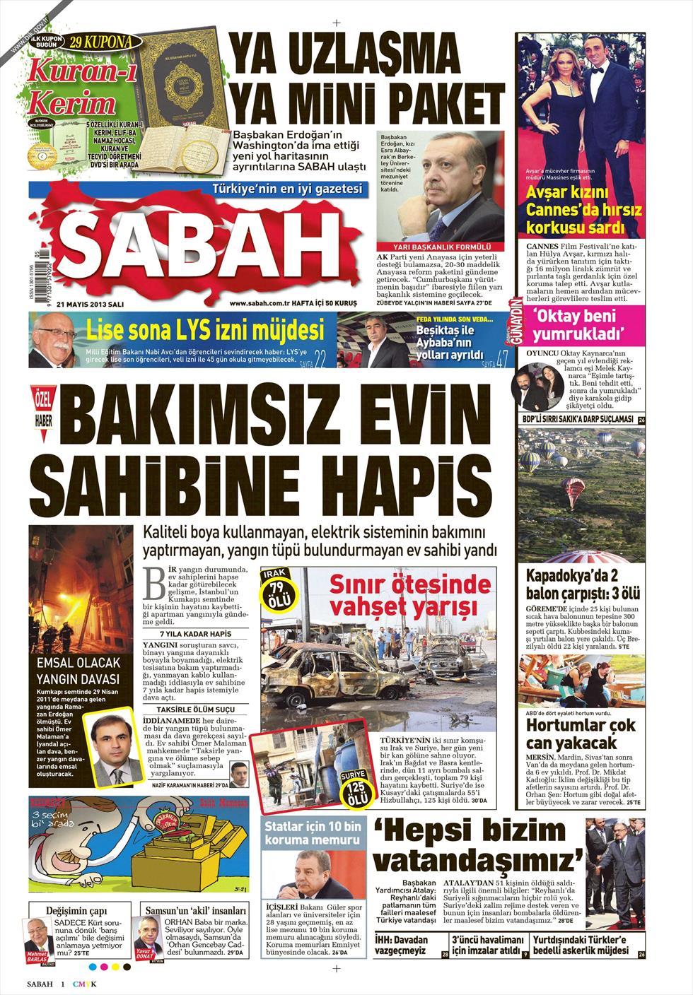 «Φυλακή σε όποιον δεν φροντίζει το σπίτι του» είναι ο τίτλος της Sabah. H τουρκική εφημερίδα τονίζει πως όσοι ιδιοκτήτες ακινήτων δεν χρησιμοποιούν ποιοτικά χρώματα, δεν φροντίζουν τα ηλεκτρολογικά των σπιτιών τους και δεν διαθέτουν πυροσβεστήρες στα σπίτια τους θα αντιμετωπίζουν ποινή κάθειρξης μέχρι και 7 έτη.