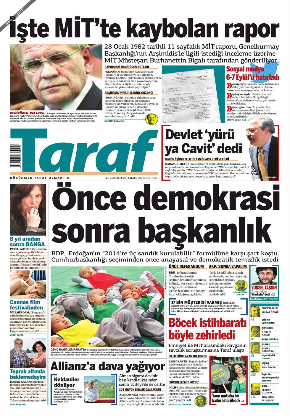 «Πρώτα ο εκδημοκρατισμός και μετά η προεδρία» είναι ο τίτλος της Τaraf. H τουρκική εφημερίδα τονίζει πως το φιλο-κουρδικό Κόμμα Ειρήνης και Δημοκρατίας έθεσε ως ορο τις αλλαγές στο Σύνταγμα και τον εκδημοκρατισμό «για να στηρίξη τον Ερντογάν στα σχέδια του για την προεδρία».