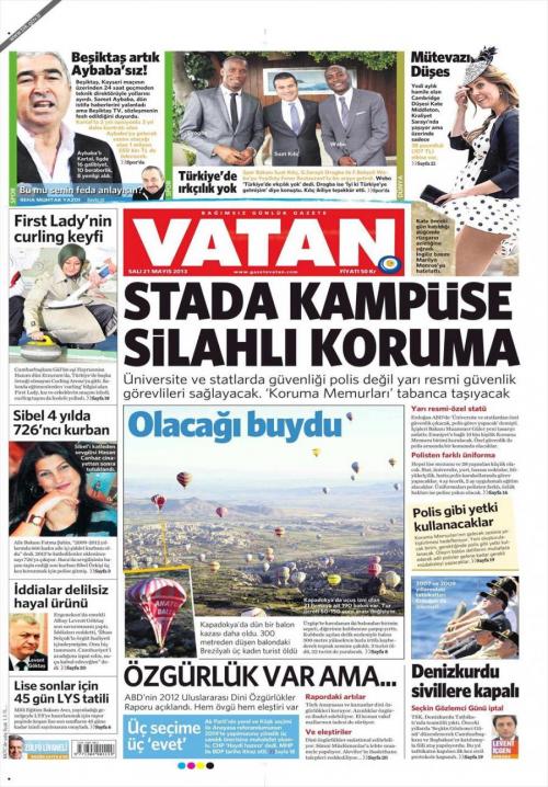 «Ένοπλοι φρουροί στα γήπεδα και στα πανεπιστήμια» είναι ο τίτλος της Vatan. H τουρκική εφημερίδα αναφέρεται στην απόφαση της τουρκικής κυβέρνησης για πρόσληψη 10.00 ειδικών φρουρών που θα αναλάβουν την προστασία των πανεπιστήμιων και των γηπέδων. Η αστυνομία δεν θα ασχολείται πια με την φρούρηση τους.