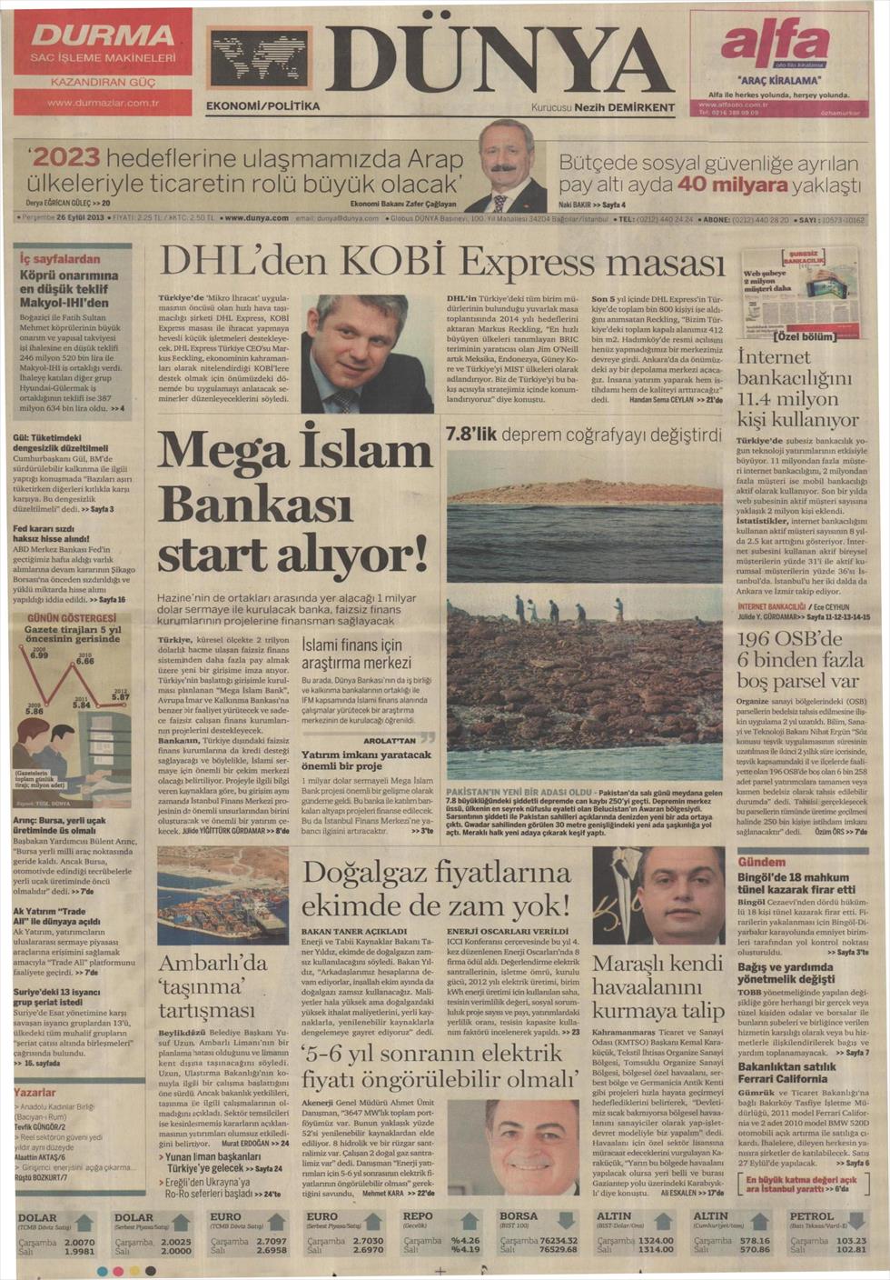 «Ξεκινά η μεγάλη Ισλαμική Τράπεζα» είναι ο τίτλος της Dünya. H τουρκική οικονομική εφημερίδα αναφέρει πως η ισλαμική τράπεζα που θα συμμετάσχει και το τουρκικό δημόσιο με ένα δισεκατομμύριο δολάρια θα ξεκινήσει σε λίγες ημέρες τη λειτουργία της και θα δίνει χαμηλότοκα δάνεια σε επιχειρήσεις και σε τράπεζες που λειτουργούν με σύστημα χωρίς τόκους αλλά πληρώνουν με αποδόσεις.