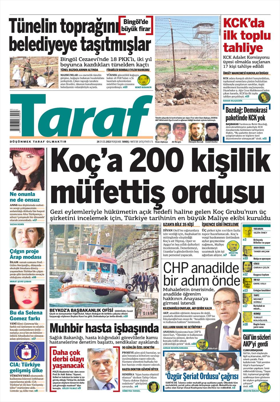 “200 ελεγκτές στον όμιλο Κοτς» είναι ο τίτλος της Taraf. H τουρκική εφημερίδα αναφέρει πως αριθμός ρεκόρ οικονομικών ελεγκτών έχουν εισέλθει στα γραφεία και στις εταιρείες του ομίλου Κοτς. « 200 άτομα είναι αριθμός ρεκόρ» γράφει η εφημερίδα που εικάζει πως ο λόγος των ελέγχων ενδέχεται να σχετίζεται στη στήριξη που έδωσε ο επιχειρηματίας Μουσταφά Κοτς σε κάποιους διαδηλωτές του πάρκου Γκεζί.