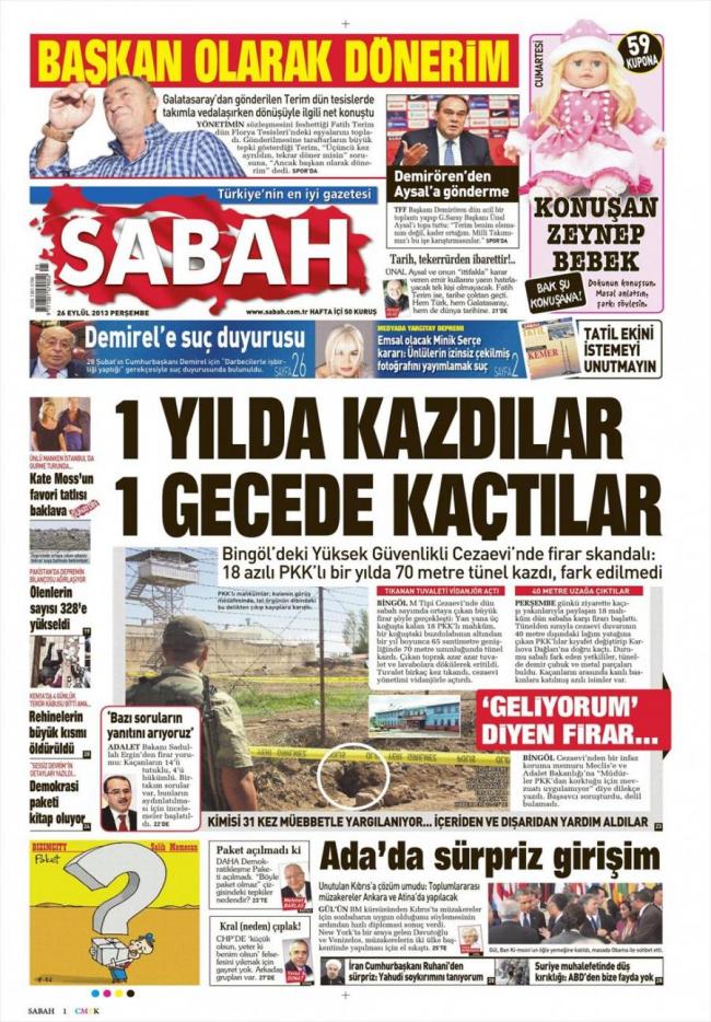 « Έναν χρόνο έσκαβαν και απόδραση σε μια νύχτα» είναι ο τίτλος της Sabah που αναφέρεται στην στο θέμα της δραπέτευσης 18 κρατουμένων από τις φυλακές της πόλης Μπίγκιολ Η τουρκική εφημερίδα αναφέρει πως « 18 κρατούμενοι μέσα σε ένα έτος έσκαψαν τούνελ μήκους 70 μέτρων και κανένας δεν αντιλήφθηκε τίποτα».Σύμφωνα με την εφημερίδα όλοι οι δραπέτες είναι μέλη του PKK.