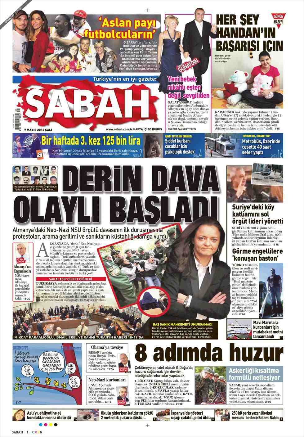 «Η «βαθιά» δίκη ξεκίνησε με επεισόδια» είναι ο τίτλος της Sabah. H τουρκική εφημερίδα αναφέρεται στη δίκη των ναζί στο Μόναχο και αναφέρει πως «προκλήθηκαν επεισόδια στο σωματικό έλεγχο, υπήρχε το θράσος των κατηγορουμένων αλλά και αντιδράσεις των οικογενειών των θυμάτων».