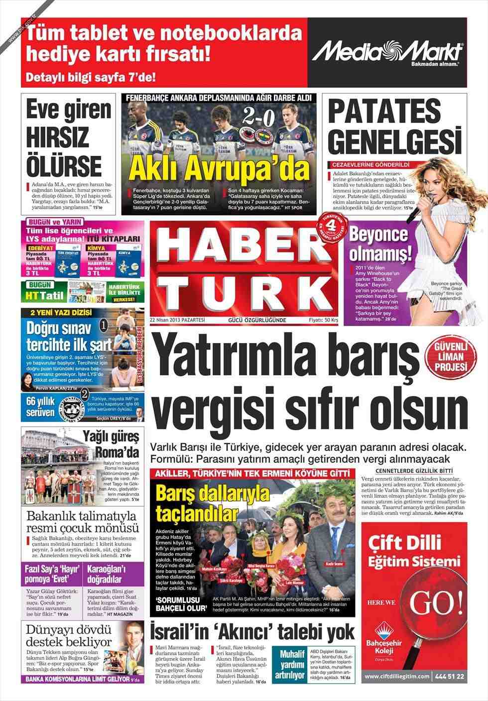 «Ο φόρος για την αμνηστία να μηδενιστεί με τις επενδύσεις» είναι ο τίτλος της Ηabertürk. H τουρκική εφημερίδα αναφέρει την άποψη σε περίπτωση που δοθεί φορολογική αμνηστία σε όσους επιστρέψουν τα χρήματα τους από το εξωτερικό στην Τουρκία, ο φόρος που θα επιβληθεί να είναι μηδενικός σε όσους επενδύσουν αυτά τα χρήματα.