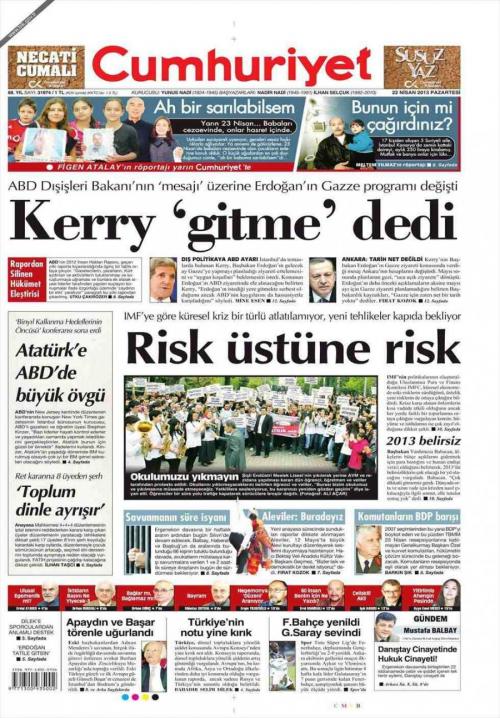 « Ο Κέρι είπε “μην πας”» είναι ο τίτλος της Cumhuriyet. H τουρκική εφημερίδα γράφει πως ο Τζον Κέρι έστειλε μήνυμα στον Ρετζέπ Ταγίπ Ερντογάν να μην επισκεφθεί τη Γάζα. « Μετά το μήνυμα του Κέρι ο Ερντογάν άλλαξε το πρόγραμμα του για την επίσκεψη στη Γάζα» γράφει η εφημερίδα.