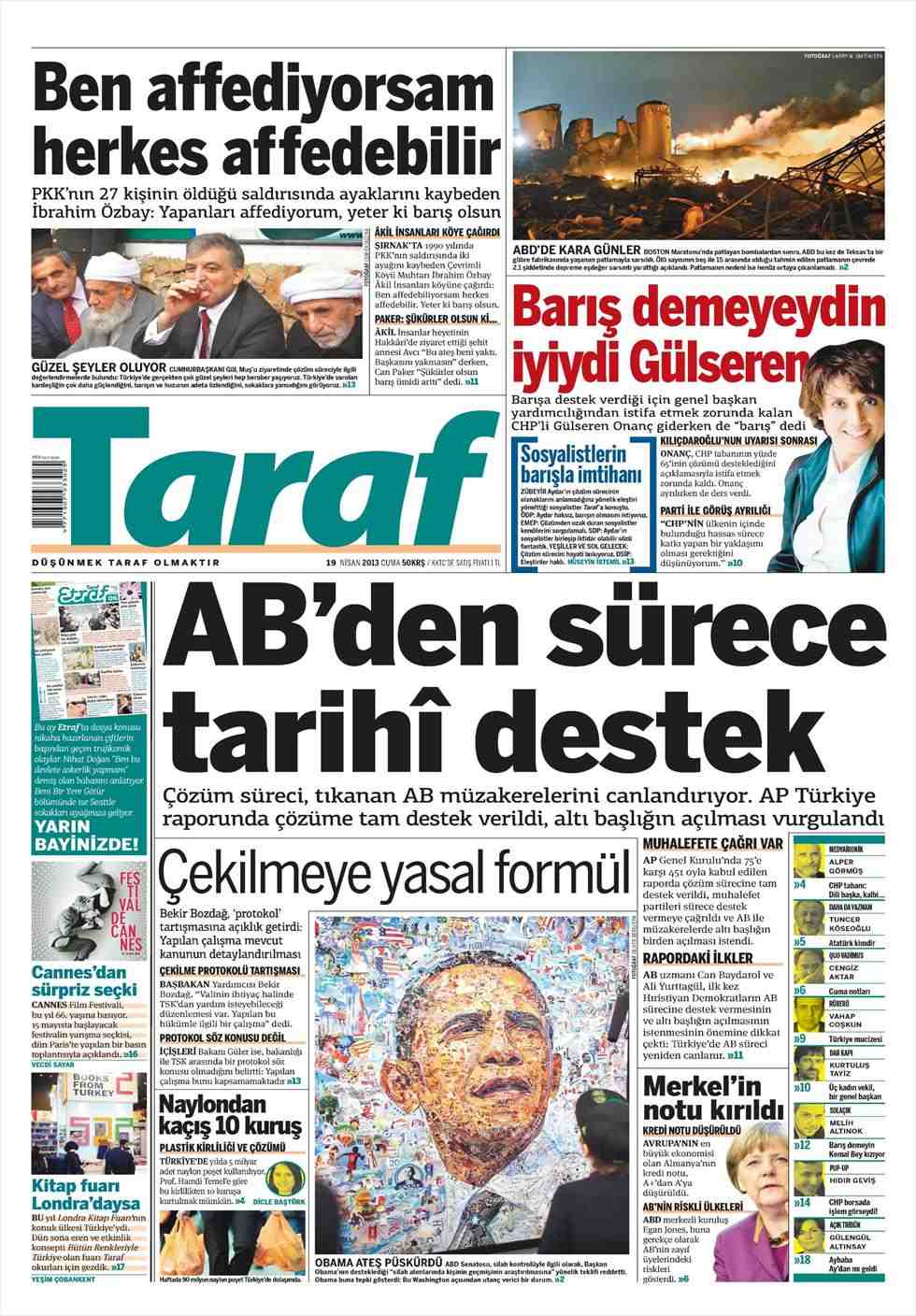 «Πλήρης στήριξη από την Ε.Ε στην διαδικασία της επιλύσης (σ.σ. Κουρδικού)». Η τουρκική εφημερίδα αναφέρει πως η Ε.Ε. στηρίζει την προσπάθεια επίλυσης του Κουρδικού. « Το Ευρωκοινοβούλιο σε ανακοίνωση του τόνισε τη στήριξη του και ανέφερε πως η Τουρκία άνοιξε 6 κεφάλαια στις ενταξιακές διαπραγματεύσεις προς την Ε.Ε.»