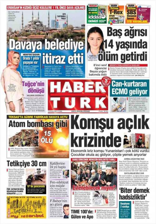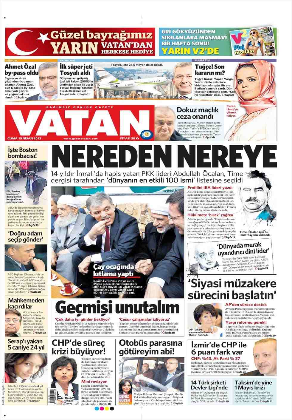 «Από πού φτάσαμε που» είναι ο τίτλος της Vatan. H τουρκική εφημερίδα αναφέρει πως « ο 14 χρόνια φυλακισμένος στη νήσο Ιμραλι Οτζαλάν από το περιοδικό Τime εξελέγη ως από τα πιο ισχυρά 100 πρόσωπα του κόσμου του 2013».
