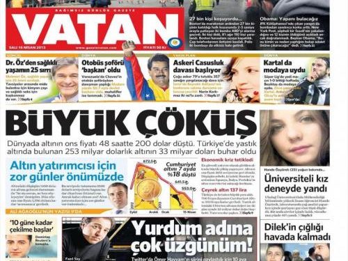 «Μεγάλη πτώση» είναι ο τίτλος της Vatan. H τουρκική εφημερίδα αναφέρεται στην πτώση της τιμής του χρυσού και τονίζει πως μέσα σε 48 ώρες μειώθηκε η τιμή του 200 δολάρια η ουγκιά. Σύμφωνα με την εφημερίδα ο χρυσός που βρίσκεται «κάτω από τα μαξιλάρια» στην Τουρκία φτάνει τα 253 δισεκατομμύρια δολάρια , έχασε την αξία του κατά 33 δισεκατομμύρια.