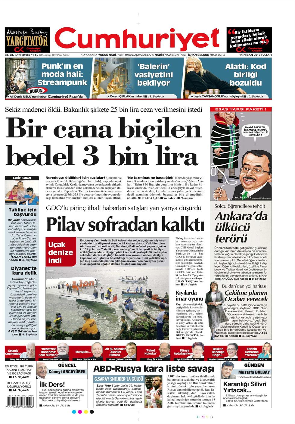 «Μια ζωή θεωρήθηκε πως κοστίζει 3000 λίρες( 1300 Ευρώ)» είναι ο τίτλος της Cumhuriyet. H τουρκική εφημερίδα αναφέρει πως μετα το θάνατο 8 μεταλλωρύχων το Υπουργείο Εργασίας αποφάσισε να δοθεί αποζημίωση στις οικογένειες των θυμάτων το συνολικό ποσό των 25 χιλιάδων λιρών.