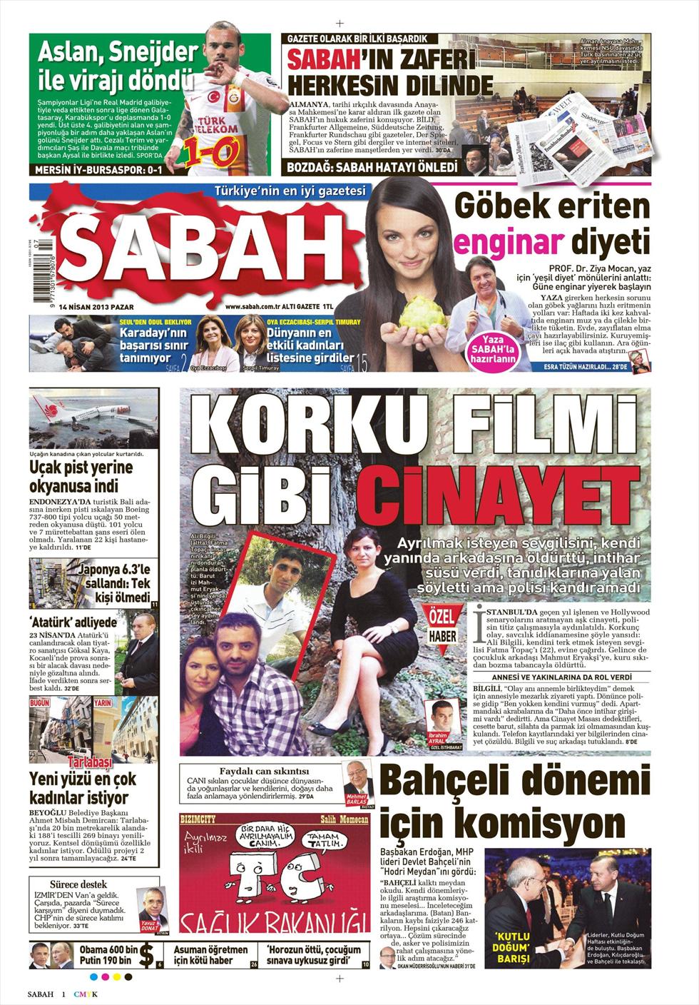 « Δολοφονία σαν ταινία θρίλερ» είναι ο τίτλος της Sabah. H τουρκική εφημερίδα αναφέρεται στην υπόθεση δολοφονίας μιας κοπέλας από τον φίλο της ο οποίος την σκότωσε επειδή η ίδια ήθελε να τερματίσει τη σχέση τους.