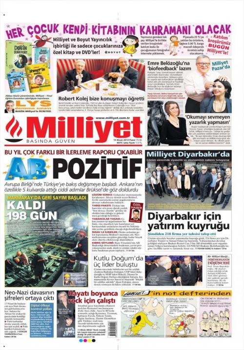 «ΑΒ (σ.σ. Ε.Ε.)θετικό» είναι ο τίτλος της Milliyet. H τουρκική εφημερίδα αναφέρει πως η φετινή έκθεση της Ε.Ε. σχετικά με τη ενταξιακή πορεία της Τουρκίας ενδέχεται να είναι πιο θετική από τα προηγούμενα έτη, «καθώς οι Ευρωπαίοθ διαπιστώνουν πως σε 5 κεφάλαια έχουν γίνει πολλά θετικά βήματα».