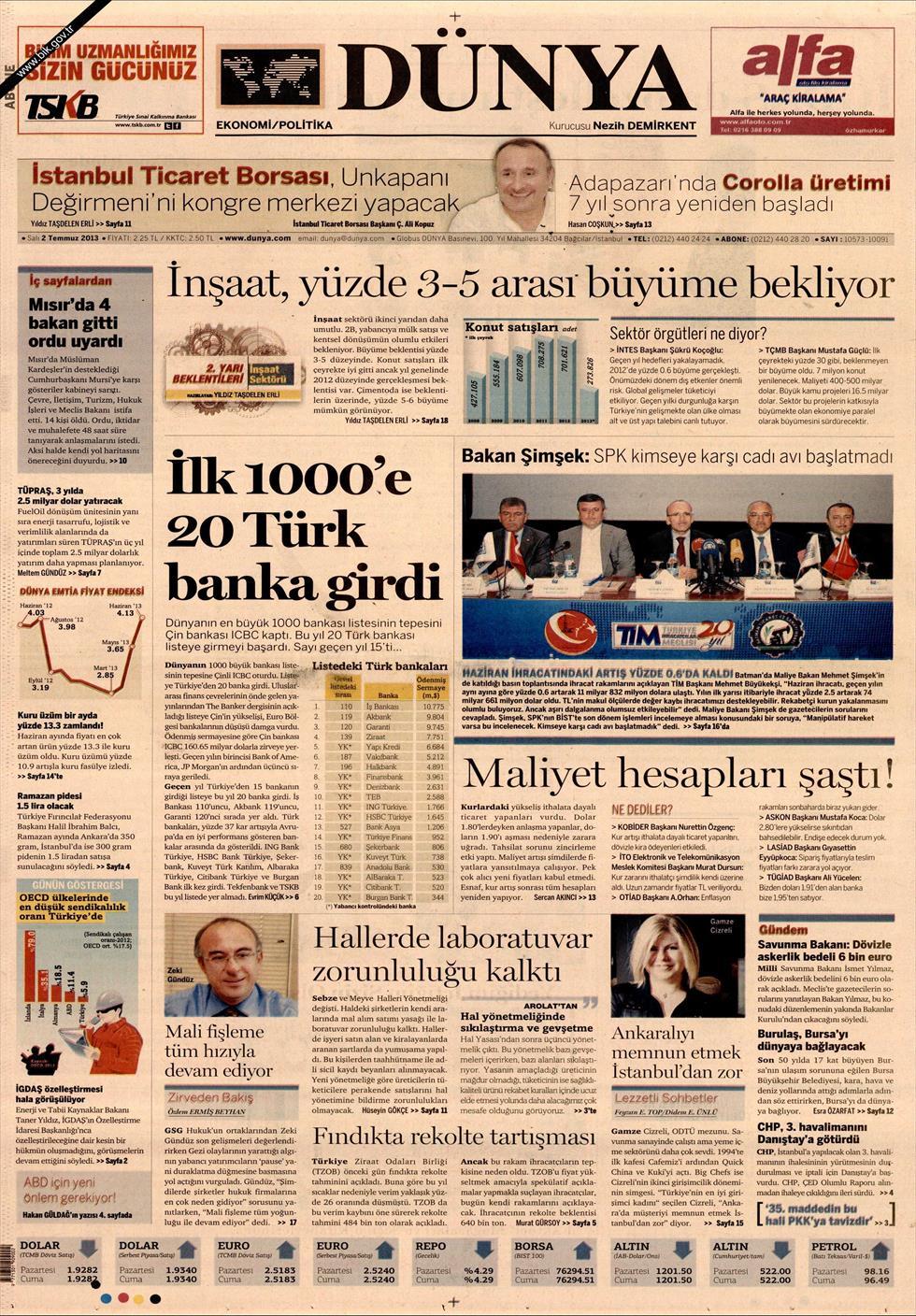 «20 τουρκικές τράπεζες στη λίστα των 1000 μεγάλων τραπεζών του κόσμου» είναι ο τίτλος της οικονομικής εφημερίδας Dünya. Σύμφωνα με την τουρκική εφημερίδα «η κινέζικη ICBC είναι η μεγαλύτερη τράπεζα του κόσμου. Το 2013 20 τράπεζες της Τουρκίας κατάφεραν να μπουν στη λίστα με τις μεγαλύτερες τράπεζες ενώ το 2012 ο αριθμός τους έφτανε τις 15 τουρκικές τράπεζες»