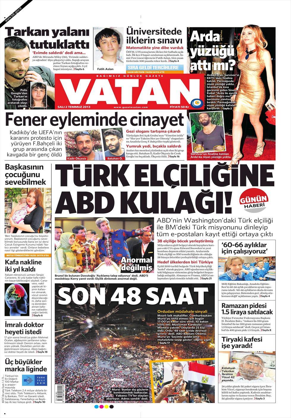«Αμερικανικό αυτί στην πρεσβεία της Τουρκίας» είναι ο τίτλος της Habertürk. Σύμφωνα με την τουρκική εφημερίδα γράφει πως « αποκαλύφθηκε ότι οι ΗΠΑ υπέκλεπταν τις συνομιλίες της τουρκικής πρεσβείας στην Ουάσιγκτον όπως και διάβαζαν όλα τα e-mails της αντιπροσωπείας της Τουρκίας στον ΟΗΕ».