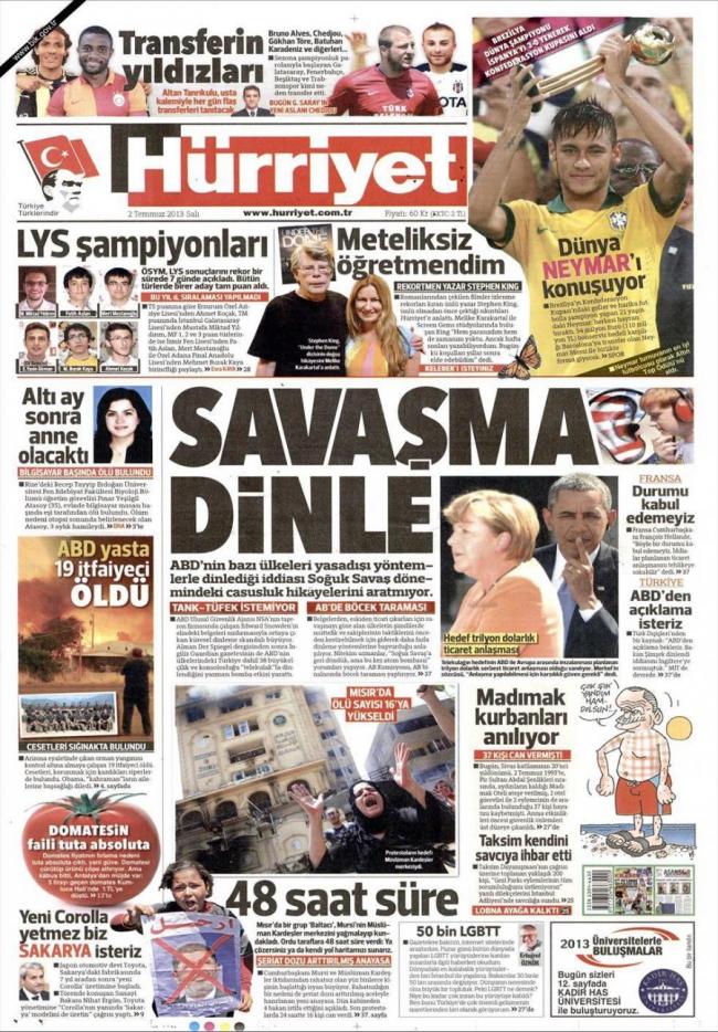 «Μην πολεμάς αλλά άκου» είναι ο τίτλος της Hürriyet. H τουρκική εφημερίδα αναφέρεται στο θέμα των αμερικανικών υποκλοπών και γράφει «ο ισχυρισμός πως οι ΗΠΑ άκουγαν με μυστικό τρόπο τις συνομιλίες ηγετών άλλων κρατών θυμίζει την εποχή του ψυχρού πολέμου».