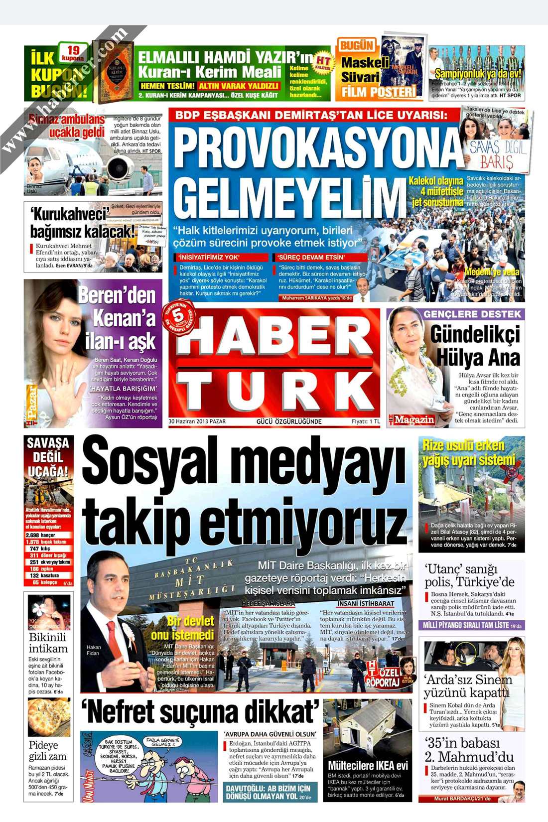 «Δεν παρακολουθούμε τα κοινωνικά δίκτυα» είναι ο τίτλος της Habertürk. H τουρκική εφημερίδα αναφέρεται στην ανακοίνωση των τουρκικών μυστικών υπηρεσιών ΜΙΤ που διαψεύδουν πως παρακολουθείται το Twitter και το Facebook. Στην ανακοίνωση γίνεται αναφορά πως η ΜΙΤ τονίζει πως δεν υπάρχει δυνατότητα παρακολουθήσης εκατομμυρίων χρηστών και πως η υπηρεσία δεν έχει στόχο την προσωπική παρακολούθηση δεδομένων.