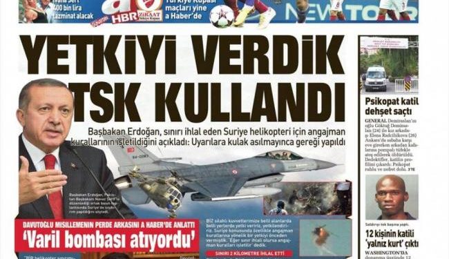 «Δώσαμε εντολή και οι τουρκικές Ένοπλες Δυνάμεις έναν χρήση της εντολής» είναι ο τίτλος της Sabah που φιλοξενεί δηλώσεις του Ρετζέπ Ταγίπ Ερντογάν σχετικά με την κατάρριψη του ελικοπτέρου της Συρίας. Ο τούρκος πρωθυπουργός τονίζει πως « δεν έγιναν σεβαστές οι προειδοποιήσεις και συνέβη αυτό που έπρεπε να γίνει».
