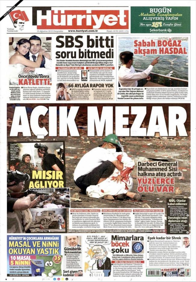 « Ανοιχτός τάφος» είναι ο τίτλος της Hürriyet που αναφέρεται στις εξελίξεις στην Αίγυπτο. Η τουρκική εφημερίδα αναφέρει πως «ο πραξικοπηματίας Σίσι έδωσε εντολή για πυτ εναντίον του λαού του. Εκατοντάδες είναι οι νεκροί, όλη η Αίγυπτος κλαίει».