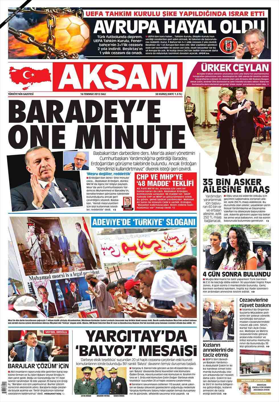 «Οne Minute στον Βaradey» είναι ο τίτλος της Αkşam. H τουρκική εφημερίδα αναφέρει πως o Μπαραντέϊ ζήτησε να συναντηθεί με τον Ερντογάν «όμως ο τούρκος πρωθυπουργός αρνήθηκε να συναντηθεί με τον αντιπρόεδρο της Αιγύπτου για να μην δεχθεί τη νομιμοποίηση του».