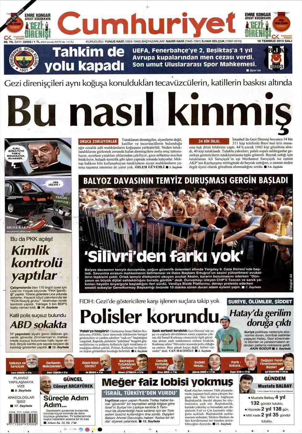 «Τι μίσος είναι αυτό;» είναι ο τίτλος της Cumhuriyet. H τουρκική εφημερίδα αναφέρει πως οι συλληφθέντες στο πάρκο Γκεζί οι οποίοι κρατούνται στις φυλακές βρίσκονται σε κελιά μαζί με βιαστές και δολοφόνους οι οποίοι τους καταπιέζουν»