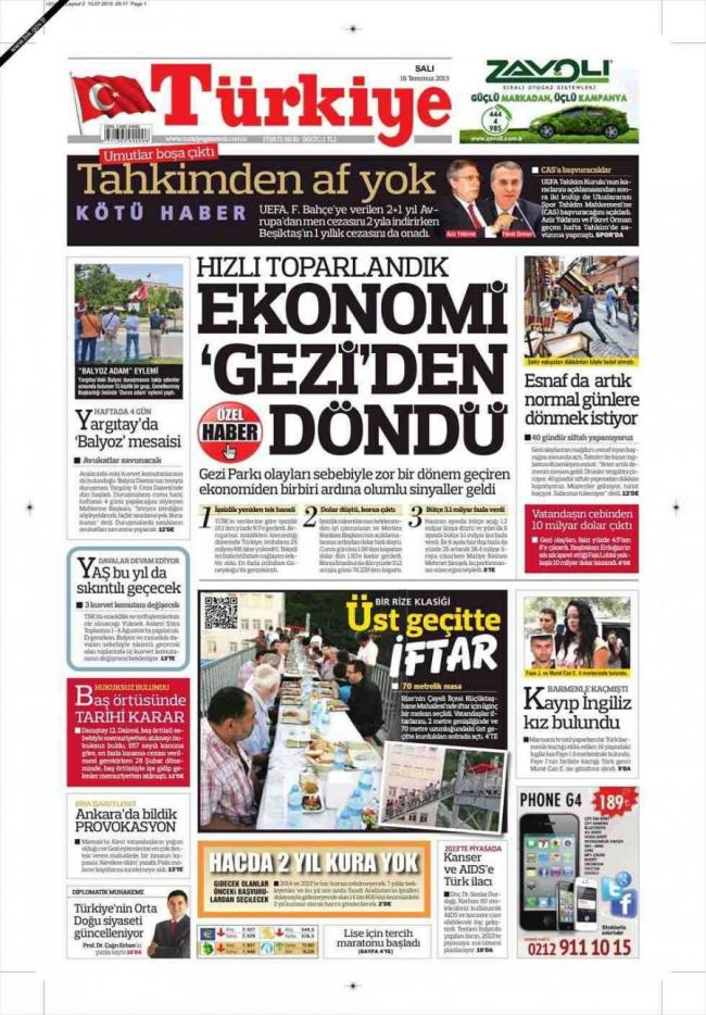 «H οικονομία γύρισε από το Γκεζί» είναι ο τίτλος της Türkiye. H τουρκική εφημερίδα αναφέρει πως η τουρκική οικονομία που κλονίστηκε με τα επεισόδια με αφορμή το πάρκο Γκεζί αρχίζει να δίνει σημάδια επαναφοράς και βελτίωσης καθώς μειώνεται η ανεργία και ο προϋπολογισμός δίνει πλεονάσματα.