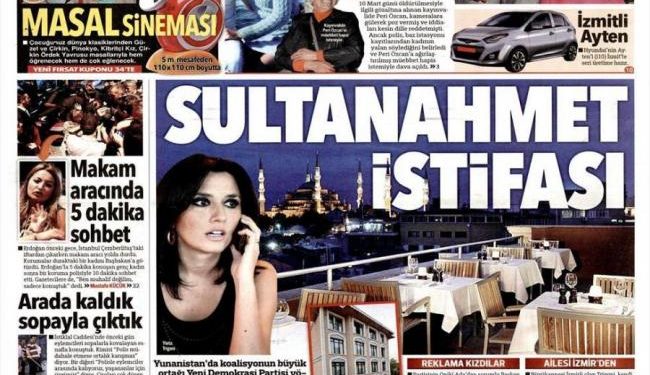 « Η παραίτηση του Σουλταναχμέτ» είναι ο τίτλος της Ηürriyet. H τουρκική εφημερίδα αναφέρεται στην υπόθεση της παραίτησης της Γιώτας Τριγώνη και γράφει πως « στέλεχος της Νέας Δημοκρατίας αναγκάσθηκε να παραιτηθεί επειδή φωτογραφήθηκε για να διαφημίσει ξενοδοχείο της Κωνσταντινούπολης στο οποίο ήταν και μέτοχος»
