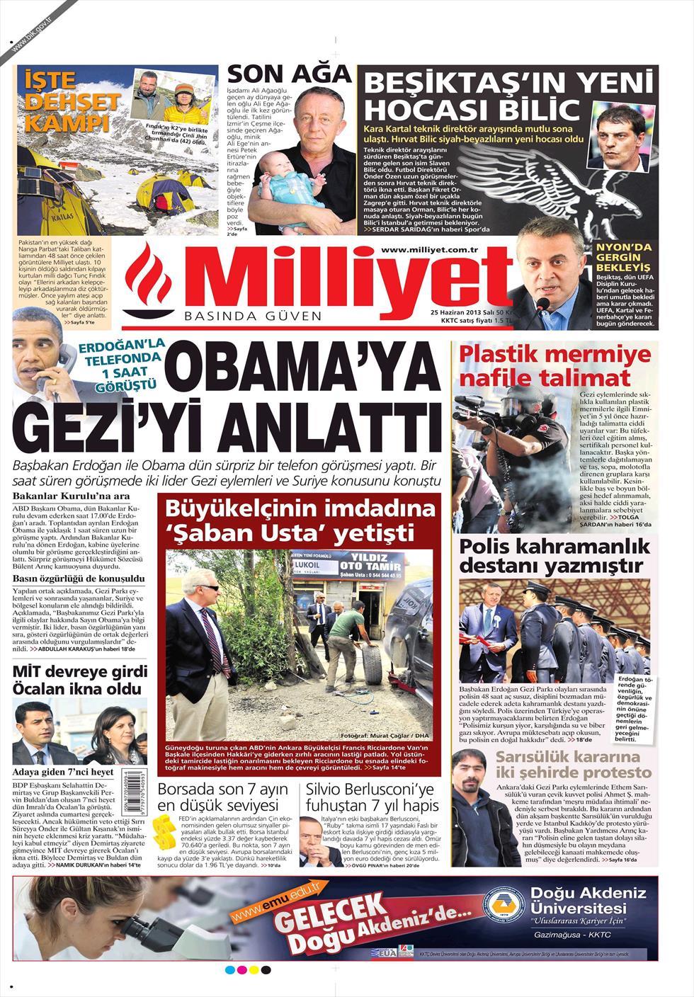 «Στον Ομπάμα εξήγησε το Γκεζί» είναι ο τίτλος της Milliyet. H τουρκική εφημερίδα αναφέρει πως ο Ρετζέπ Ταγίπ Ερντογάν είχε τηλεφωνική συνομιλία μίας ώρας με τον Μπαράκ Ομπάμα και οι δυο άνδρες συζήτησαν τα γεγονότα στην Τουρκία με αφορμή το πάρκο Γκεζί όπως και τις εξελίξεις στη Συρία.