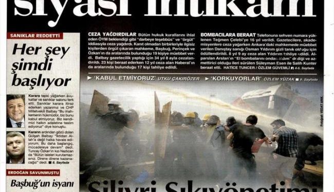 «Πολιτική εκδίκηση με το χέρι της δικαιοσύνης» είναι ο τίτλος της Cumhuriyet. H τουρκική εφημερίδα γράφει πως « το δικαστήριο της οργάνωσης Εργκενεκόν υπέγραψε μια απόφαση η οποία θα καταδικαστεί από την ιστορία». Η τουρκική εφημερίδα υποστηρίζει κατά τη διάρκεια της εκδίκασης της υπόθεσης παραβιάστηκαν βασική κανόνες της δικαιοσύνης.
