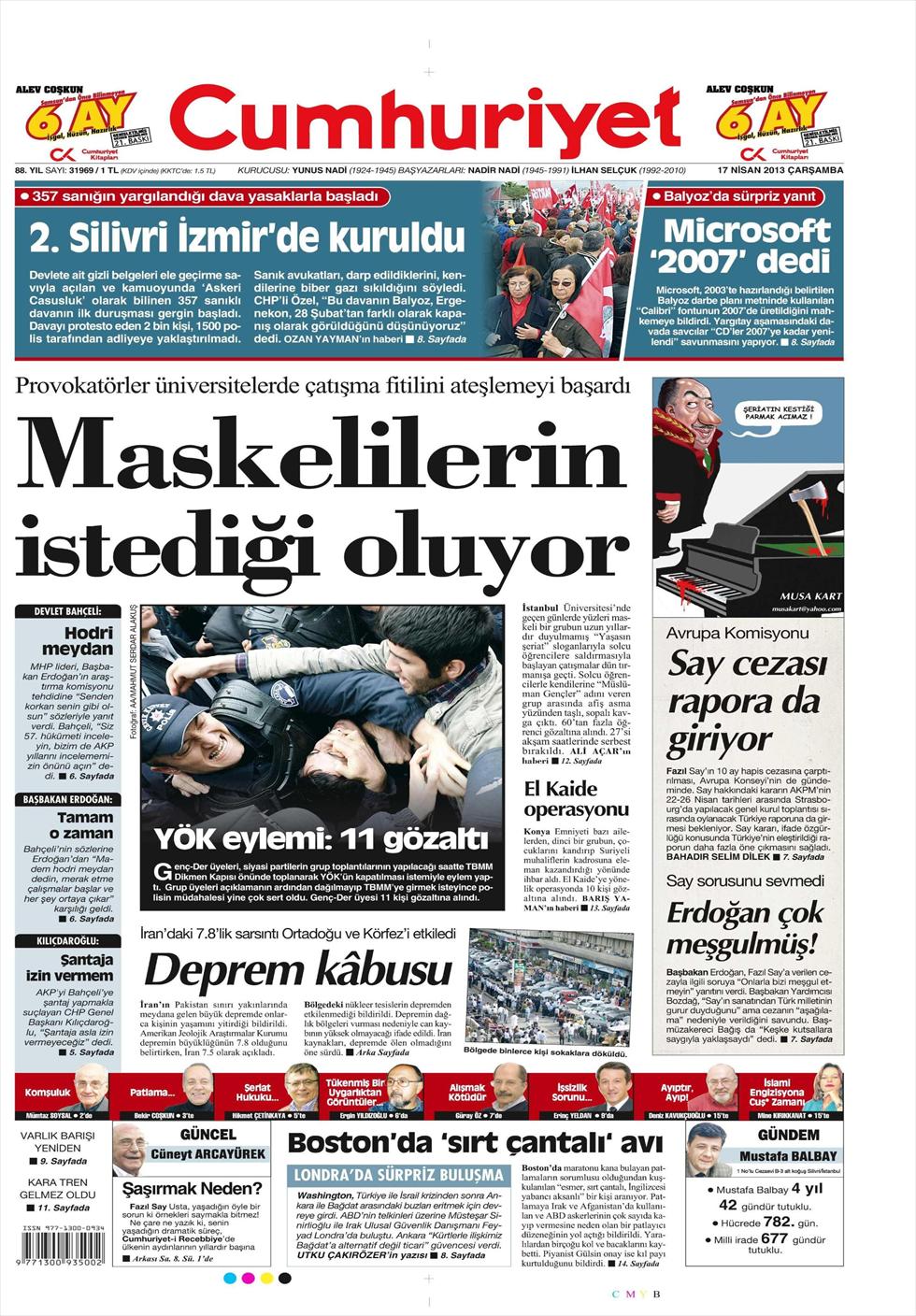 « Γίνεται αυτό θέλουν οι κουκουλοφόροι» είναι ο τίτλος της Cumhuriyet. H τουρκική εφημερίδα αναφέρεται στα επεισόδια που συμβαίνουν ανάμεσα σε φοιτητές σε διάφορα πανεπιστήμια της Τουρκίας και τονίζει πως «προβοκάτορες οδηγούν την κατάσταση ακριβώς στο σημείο που θέλουν».
