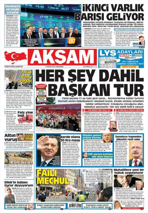 «Προεδρική εκδρομή με όλα μέσα» είναι ο τίτλος της Akşam. H τουρκική εφημερίδα αναφέρει πως έχουν απομείνει 11 μήνες για τις τοπικές εκλογές και οι δήμαρχοι οργανώνουν εκδρομές με λεωφορεία για να ικανοποιήσουν τους ψηφοφόρους τους. Η ίδια εφημερίδα τονίζει πως οι εταιρείες ενοικίασης λεωφορείων δεν προλαβαίνουν τη ζήτηση.