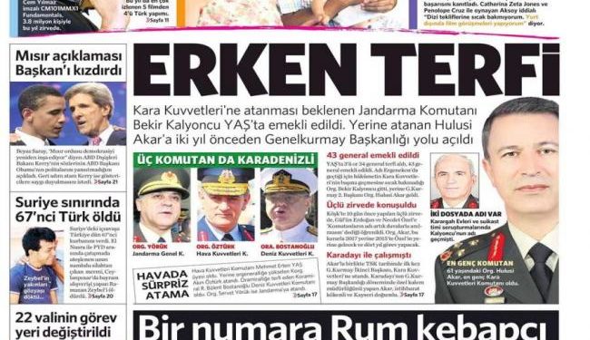 «Η ρύθμιση της Εργκενεκόν» είναι ο τίτλος της Türkiye. H τουρκική εφημερίδα γράφει πως « το Ανώτατο Στρατιωτικό Συμβούλιο καθόρισε τη νέα ηγεσία των Ενόπλων Δυνάμεων. Ο Μπεκίρ Καλγιοντζού «σκάλωσε» λόγω της εμπλοκής του ονόματος του στις δίκες της Εργκενεκόν. Το 2015 ο αρχηγός των Ενόπλων Δυνάμεων θα είναι ο Χουλουσί Ακάρ».