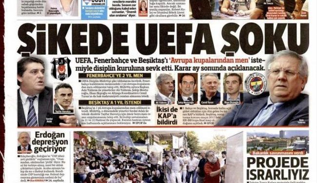 «Σοκ με την UEFA για στημένα παιχνίδια» είναι ο τίτλος της Hürriyet. H τουρκική εφημερίδα αναφέρει πως η UEFA ζητά την απαγόρευση της συμμετοχής των δυο τουρκικών ομάδων της Φενέρμπαχτσε και της Μπεσίκτας στις ευρωπαϊκές διοργανώσεις. Ο λόγος αυτού του αιτήματος είναι πως υπάρχουν ενδείξεις συμμετοχής των δυο ομάδων σε στημένα παιχνίδια.