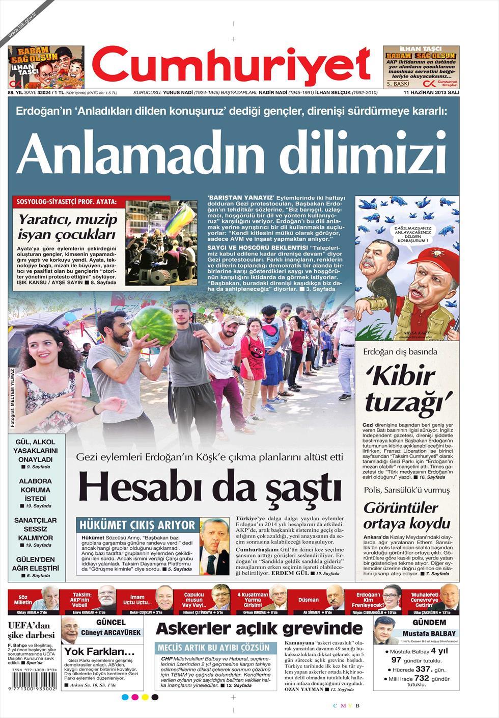 «Δεν κατάλαβες τη γλώσσα μας» είναι ο τίτλος της Cumhuriyet. H τουρκική εφημερίδα αναφέρει πως «ο Ερντογάν είχε δηλώσει « θα μιλήσουμε με τη γλώσσα που καταλαβαίνουν» όμως δεν κατάλαβε το νόημα της νεολαίας και των διαδηλωτών που βρίσκονται στους δρόμους».