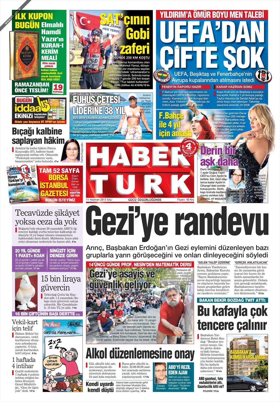 «Ραντεβού στο Γκεζί» είναι ο τίτλος της Habertürk. H τουρκική εφημερίδα αναφέρει πως ο τούρκος πρωθυπουργός την Τετάρτη θα συναντηθεί με κάποιους από τους εκπροσώπους των διαδηλωτών που έχουν εγκατασταθεί στο πάρκο Γκεζί.