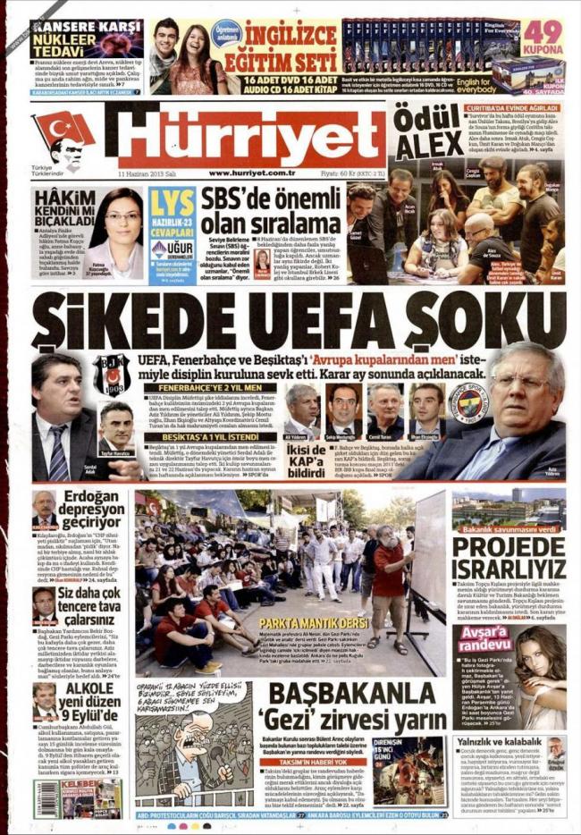 «Σοκ με την UEFA για στημένα παιχνίδια» είναι ο τίτλος της Hürriyet. H τουρκική εφημερίδα αναφέρει πως η UEFA ζητά την απαγόρευση της συμμετοχής των δυο τουρκικών ομάδων της Φενέρμπαχτσε και της Μπεσίκτας στις ευρωπαϊκές διοργανώσεις. Ο λόγος αυτού του αιτήματος είναι πως υπάρχουν ενδείξεις συμμετοχής των δυο ομάδων σε στημένα παιχνίδια.