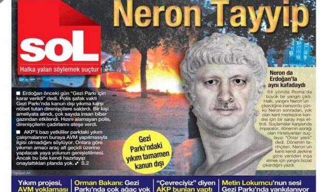 «Ταγίπ ο Νέρωνας» είναι ο τίτλος της εφημερίδας Sol. H τουρκική εφημερίδα αναφέρεται «στο θέμα της επέμβασης του Ερντογάν και του δήμου της Κωνσταντινούπολης για την εξαφάνιση του πάρκου στην πλατεία Ταξίμ όπου θα χτιστεί εμπορικό κέντρο. 4 ημέρες ο κόσμος αντιστέκεται. Οι αστυνομικοί έκαψαν τις σκηνές των διαδηλωτών» αναφέρει η εφημερίδα που παρομοιάζει τον τούρκο πρωθυπουργό με τον Νέρωνα, «καθώς ο αυτοκράτορας της Ρώμης είχε κάψει την πόλη για να τη διαμορφώσει σύμφωνα με τα δικά του γούστα». Η ίδια εφημερίδα γράφει « ο Ερντογάν ανακοίνωσε πως για το πάρκο Γκεζί στο Ταξίμ ελήφθησαν οι αποφάσεις και πως δεν θα υποχωρήσει».