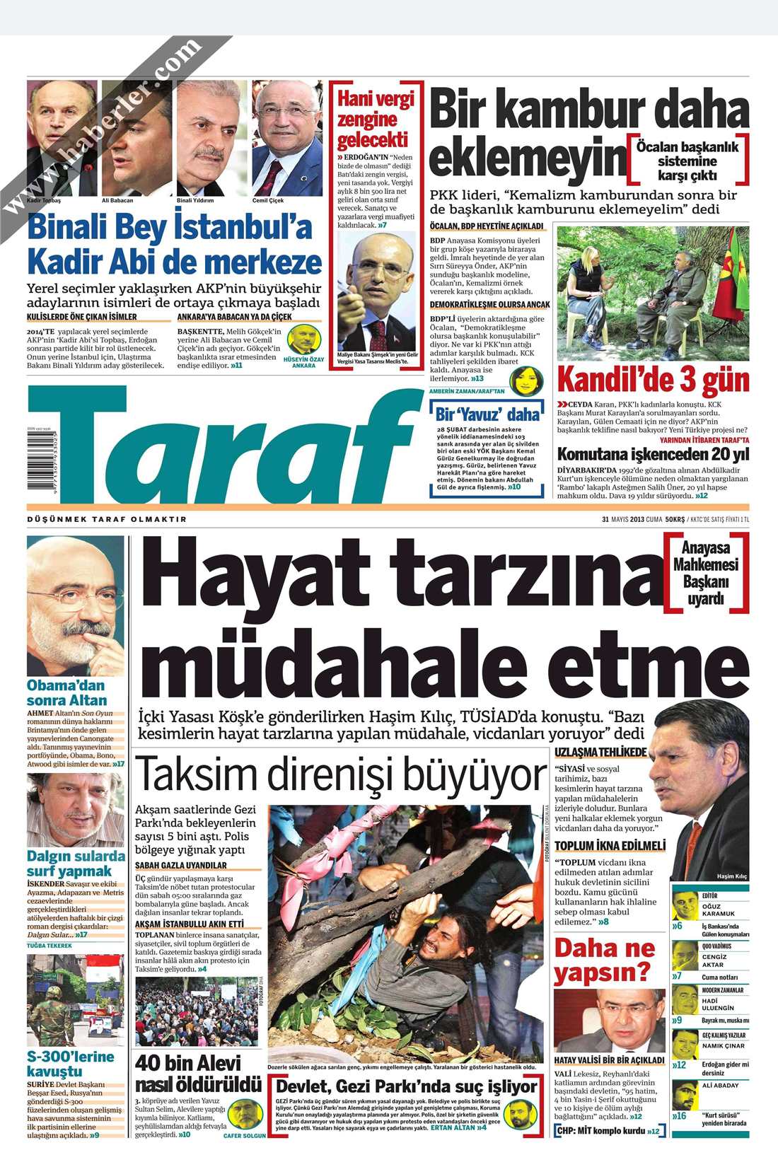 «Μην παραμβαίνεις στον τρόπο ζωής των ανθρώπων» είναι ο τίτλος της Taraf. H τουρκική εφημερίδα αναφέρεται σε δηλώσεις του προέδρου του Συνταγματικού Δικαστηρίου της Τουρκίας Χασίμ Κιλίτς ο οποίος, την ημέρα που ο νόμος για τον περιορισμό της χρήσης του αλκοόλ αποστέλλονταν προς υπογραφή στο προεδρικό Μέγαρο τόνισε πως «οι επεμβάσεις που γίνονται στον τρόπο ζωής των ανθρώπων κουράζουν τις συνειδήσεις» δήλωσε ο Κιλιτς.